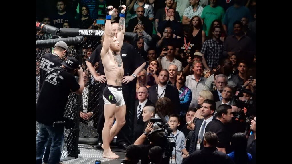 Just about any Conor McGregor walkout has this same ability to create a feeling of grandeur and excitement. Most notably dramatic was his walkout for UFC 189 when he faced Chad Mendes for the UFC Interim Featherweight belt. Normally, Conor walks out to a mix that begins with the Irish folk classic “The Foggy Dew” performed by Sinead O’Connor. As he enters the cage, the mix blends seamlessly into “The Notorious B.I.G.” made famous by the hip-hop artist of the same name. However, on this occasion, the UFC got Sinead O’Connor to come sing “The Foggy Dew” live as McGregor walked out, without attaching the hip hop transition at the end. The room was packed with Irish fans cheering, Irish flags proudly being flown from every stand. Conor made his way to the octagon, shadow-boxing with his country’s flag draped over his shoulders. As Sinead finishes singing, Conor walks onto the canvas; capturing the audiences’ hearts and imaginations with every step.